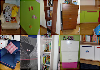 Deixamos aqui o "Antes e Depois" para que possam ver o resultado final. A cabeceira de cama foi transformada num quadro misto com íman e ardósia para as brincadeiras dos rapazes. E na estante foi criado um fundo, que foi revestido a tecido.